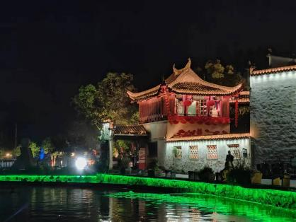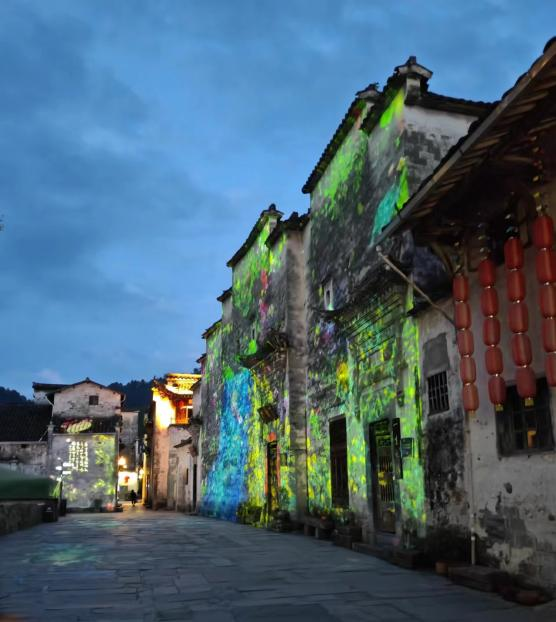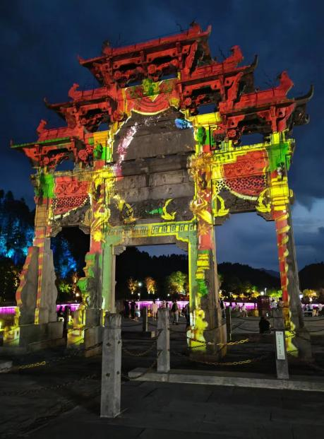 晚上,西递的灯光秀展现了同白天不一样的景色。在湖边,先从音乐喷泉开始,再到水幕电影,最后从牌坊的特效电影结束。