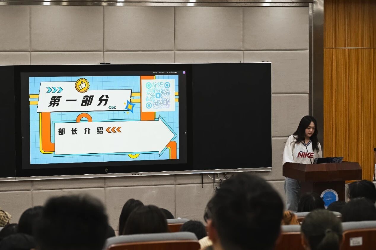 紧接着由学生会和分团委下属的各部门进行宣讲,部长们分别从人员介绍、部门概况和优势、工作属性及内容等方面进行讲解。