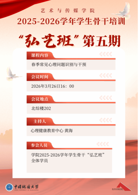 (通讯员 :凤嗣梅)为进一步贯彻落实教育部《关于全面推进健康学校建设的指导意见》的文件精神,落实立德树人根本任务,坚持五育并举,践行“健康第一”教育理念,将身心健康作为学生全面发展的前提和基础,bevictor伟德制定《2026年“健康艺媒”活动方案》。根据活动方案中“加强心理健康教育”的工作安排,bevictor伟德于3月26日下午,在北综楼202顺利举办了2025-2026学年学生骨干培训“弘艺班”第五期专题讲座。本次培训特邀学校心理健康教育中心黄海老师担任主讲人,学院“弘艺班”全体学员参加培训。