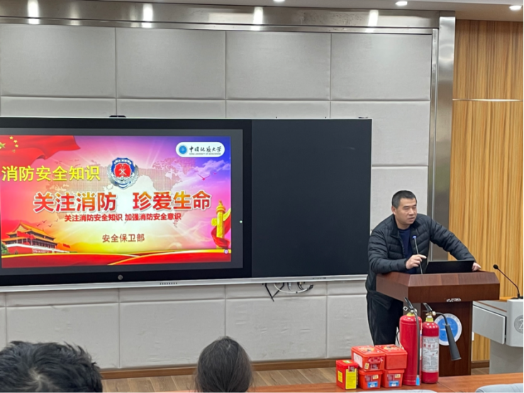刘老师结合近年来校园内发生的真实火灾案例,深入剖析了火灾发生的根本原因,并着重介绍了同学们在学生公寓和实验室等公共区域开展防火灭火工作的注意事项。刘老师强调,消防安全事关每个人的生命财产安全,每个人都应增强消防意识,从我做起,共同营造安全和谐的校园环境。同时,刘老师针对常用的二氧化碳灭火器、干粉灭火器以及防毒面罩的使用方法,通过生动有趣的讲解方式进行了现场展示。