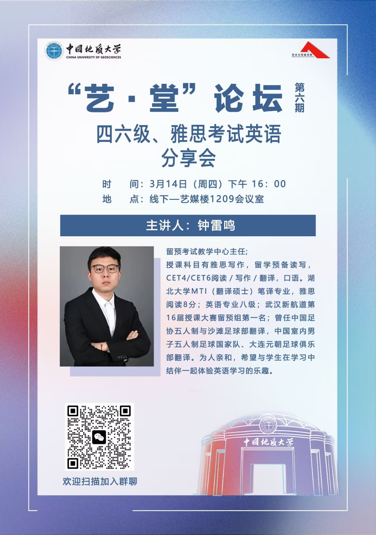 2024年3月14日下午16:00,“艺·堂”论坛第六期四六级、雅思考试英语分享会暨第七期“弘艺班”学生骨干培训于bevictor伟德1209顺利举行。学院邀请了新航道武汉学校的钟老师为同学们进行四六级和雅思英语考试的教学指导。本次讲座由兼职辅导员廖文琦主持。
