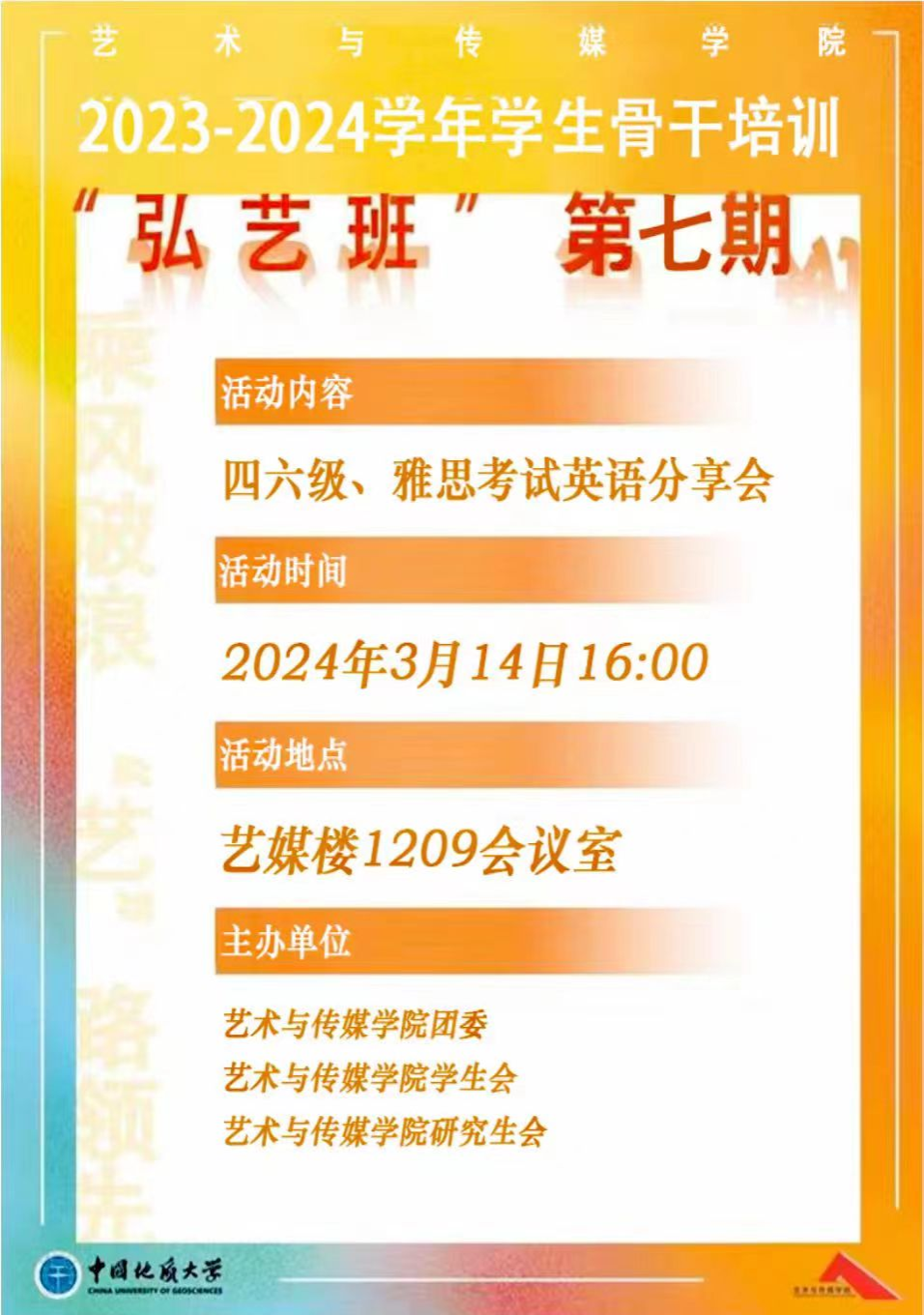 此次四六级、雅思考试英语分享会暨第七期“弘艺班”学生骨干培训使同学们对四六级考试中翻译题型的备考方法和雅思基础有了进一步的了解和掌握。学院将继续为艺媒同学的英语学习提供针对性指导及服务工作,帮助广大同学正确备考,高效率学习。