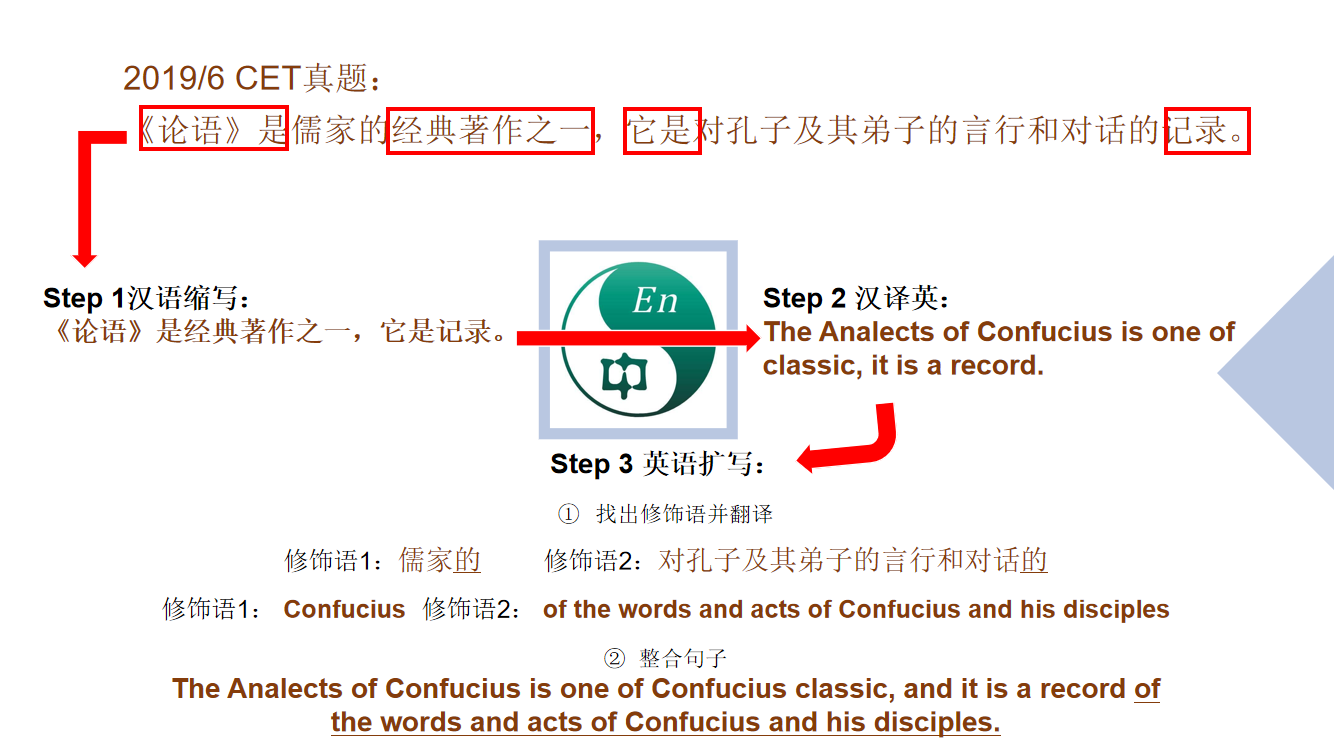 其次,钟老师为同学们详细分析了翻译做题技巧,带大家按步骤分析翻译真题。钟老师表示拿到翻译不用着急翻译,中文翻译成英文比较重要的是关于中文的理解问题。首先找到句子主干,再进行汉译英,最后进行英语扩写。