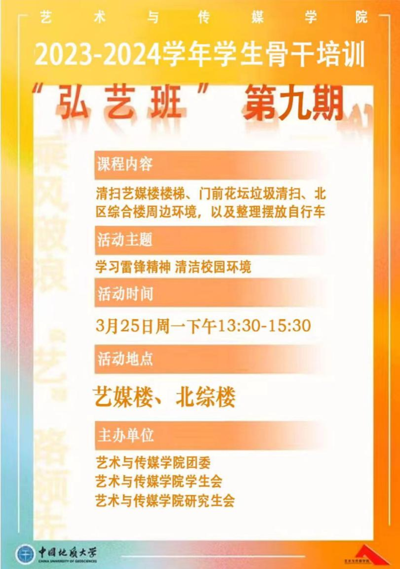为深入贯彻落实习近平总书记关于弘扬雷锋精神的重要论述,深刻把握雷锋精神的时代内涵和实践要求,弘扬“奉献、友爱、互助、进步”的志愿精神,3月25日,bevictor伟德组织学生骨干和学生志愿者开展了2023-2024学年第九期学生骨干培训“弘艺班”暨“学雷锋志愿服务月,清洁校园志愿行”志愿服务活动,引导同学们形成助人为乐、艰苦朴素的思想道德品质。