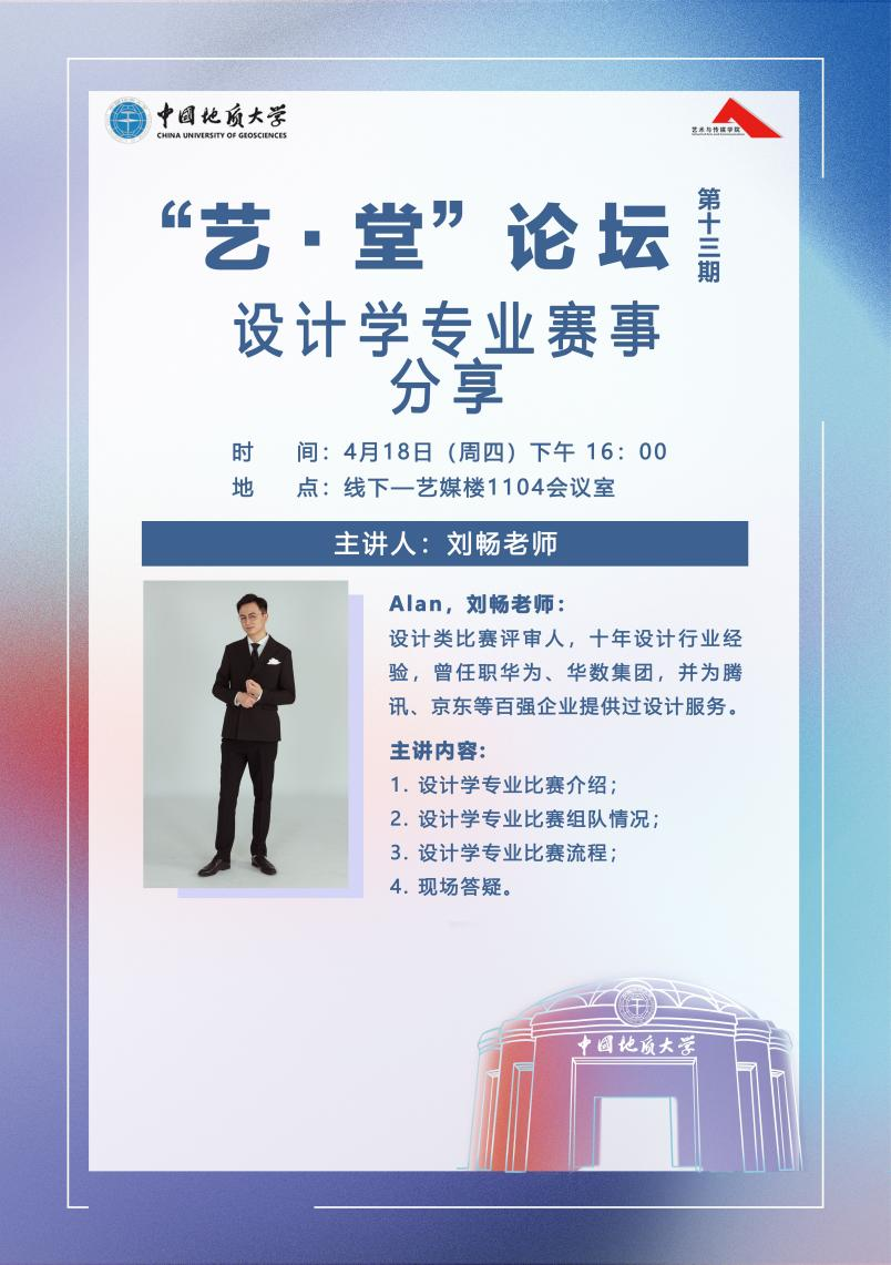 2024年4月18日下午16:00,“艺·堂”论坛第十三期设计学专业赛事分享会于bevictor伟德1104顺利举行。学院邀请了湖北三维空间教育咨询有限公司的刘畅老师为同学们进行有关设计学专业赛事的经验分享。本次讲座由兼职辅导员于梦涵主持。