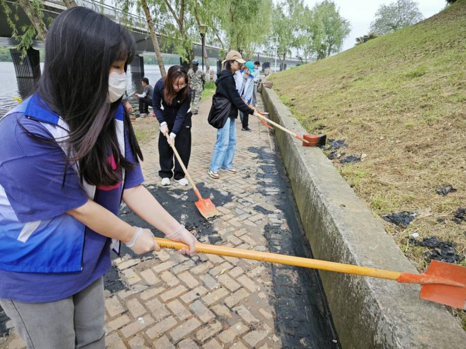 在落叶纷飞的草坪堤坝上,同学们手持扫帚,犹如灵动的画笔,细心描绘出初夏的画卷。他们耐心细致地将散落的枯叶归拢、装袋,确保每一寸土地恢复其原本的生机与清爽。与此同时,另一组志愿者则投身于堤坝旁排水沟的清理工作中。他们手拿铁锹,躬身于湖边的沟渠,将沉积的淤泥逐一挖出,疏通堵塞,恢复排水畅通,为雨季的到来做好充分准备。