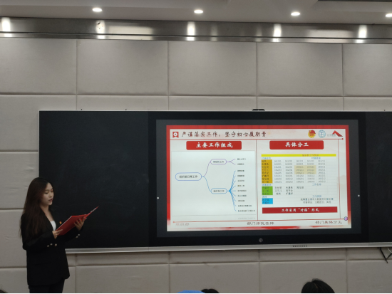 首先进行答辩的部门为组织部。答辩人员向大家介绍了组织部的具体分工与工作成果,并表示在今后,组织部会在加强构建成员纽带的前提下,不断进行创新,在工作和日常生活中做好青年大学习的思想引领,尝试设计工作手册并联合其他部门开展更多的团日活动等。