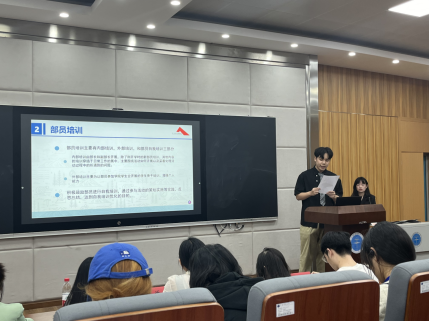 第三个答辩部门为体育部。答辩人员从分工、工作成果、开展活动等方面介绍了部门工作概况。并表示未来将创新工作模式、尝试两人一组的自主结合的工作方法,增强部门的合作对接能力。