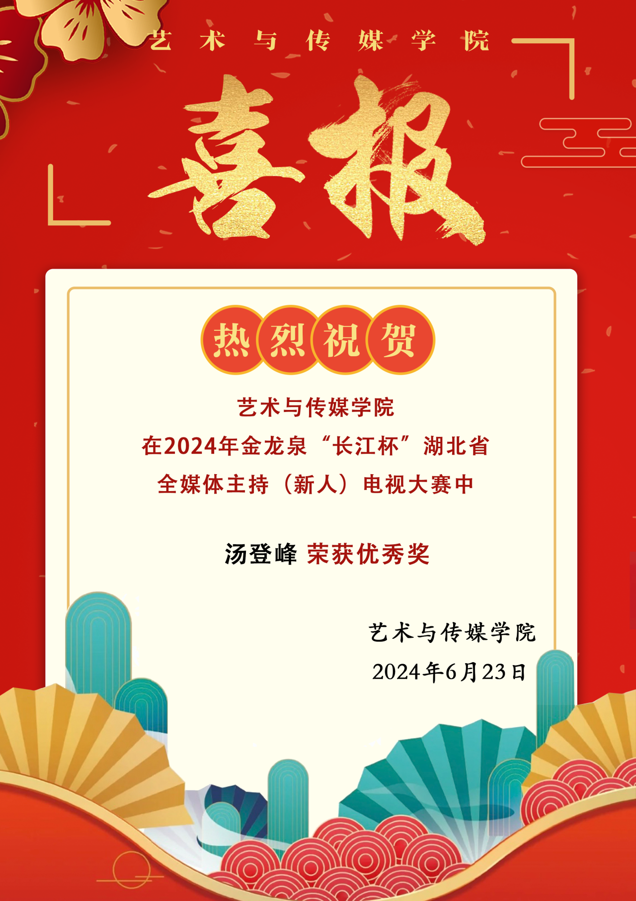 喜报!bevictor伟德汤登峰同学在2024年金龙泉“长江杯”湖北省全媒体主持(新人)电视大赛中荣获优秀奖!
