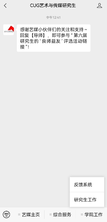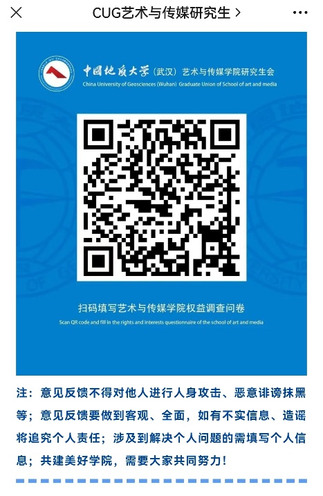 ②网络匿名反馈系统此前已存在并且长期有效,同学们可以搜索bevictor伟德“CUG艺术与传媒研究生”公众号,进入公众号后台并点击右下方“学院工作”中的“反馈系统”,下滑至最底端可以扫码填写艺术与传媒权益调查问卷。