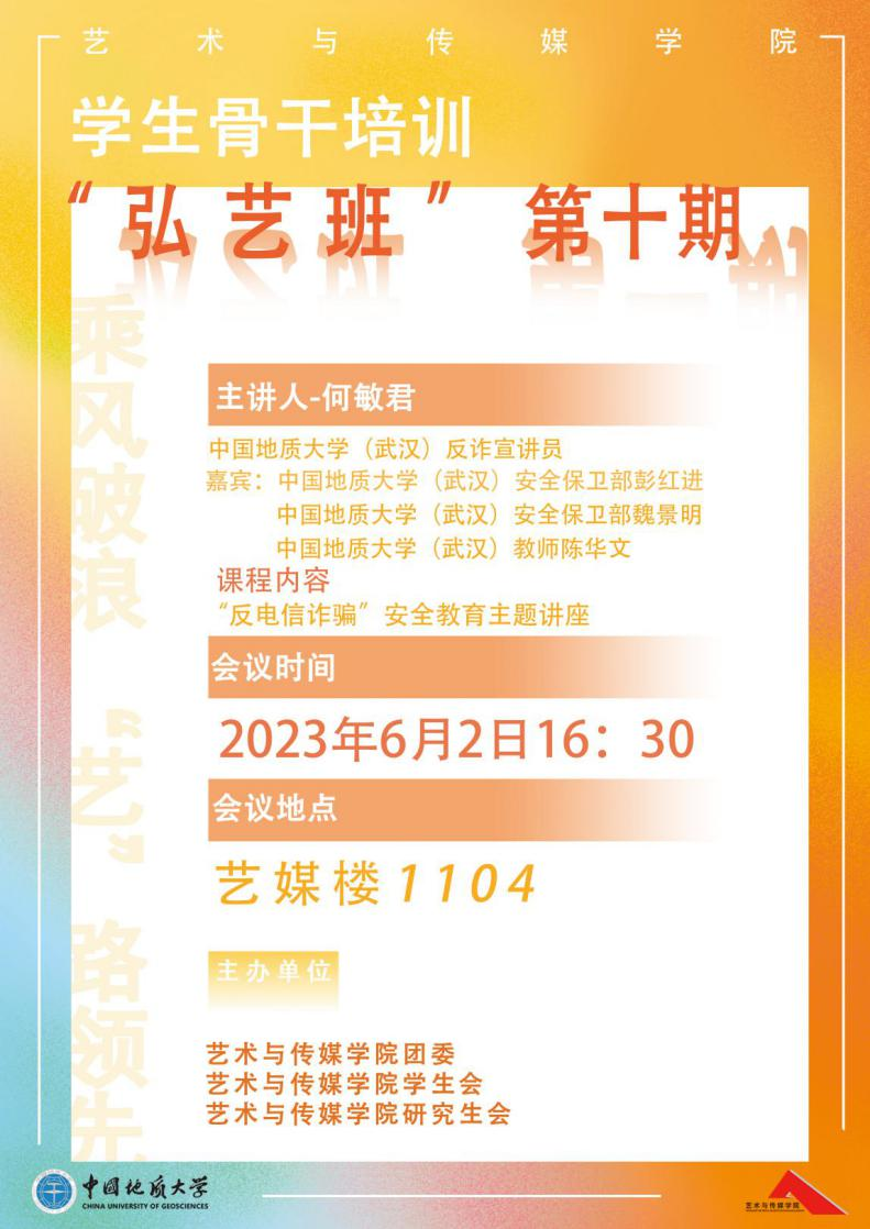 6月2日下午4点30分,bevictor伟德第十期“弘艺班”学生骨干培训在1104报告厅举行,学院研究生会和学生会的主要学生干部以及各班级学生代表参加了培训,本次安全教育培训的主题为《今天你遇到骗子了吗?——防范网络诈骗主题教育会》,由我校反诈宣讲员何敏君同学和安全保卫部魏景明、彭红进老师以及陈华文老师受邀讲解。