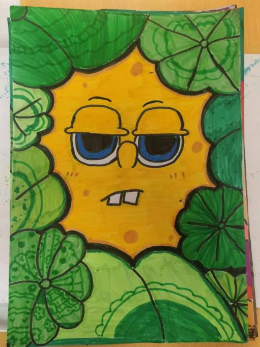 在美术C班的课上,小鱼老师向他们讲解了颜色的基础知识和配色技巧。在课后,孩子们发挥自己的创造力,在志愿者老师的指导下创作了独特的画作:绿叶环绕着奶酪黄的海绵宝宝,而他忧郁的蓝色大眼睛透露出他内心的情感。