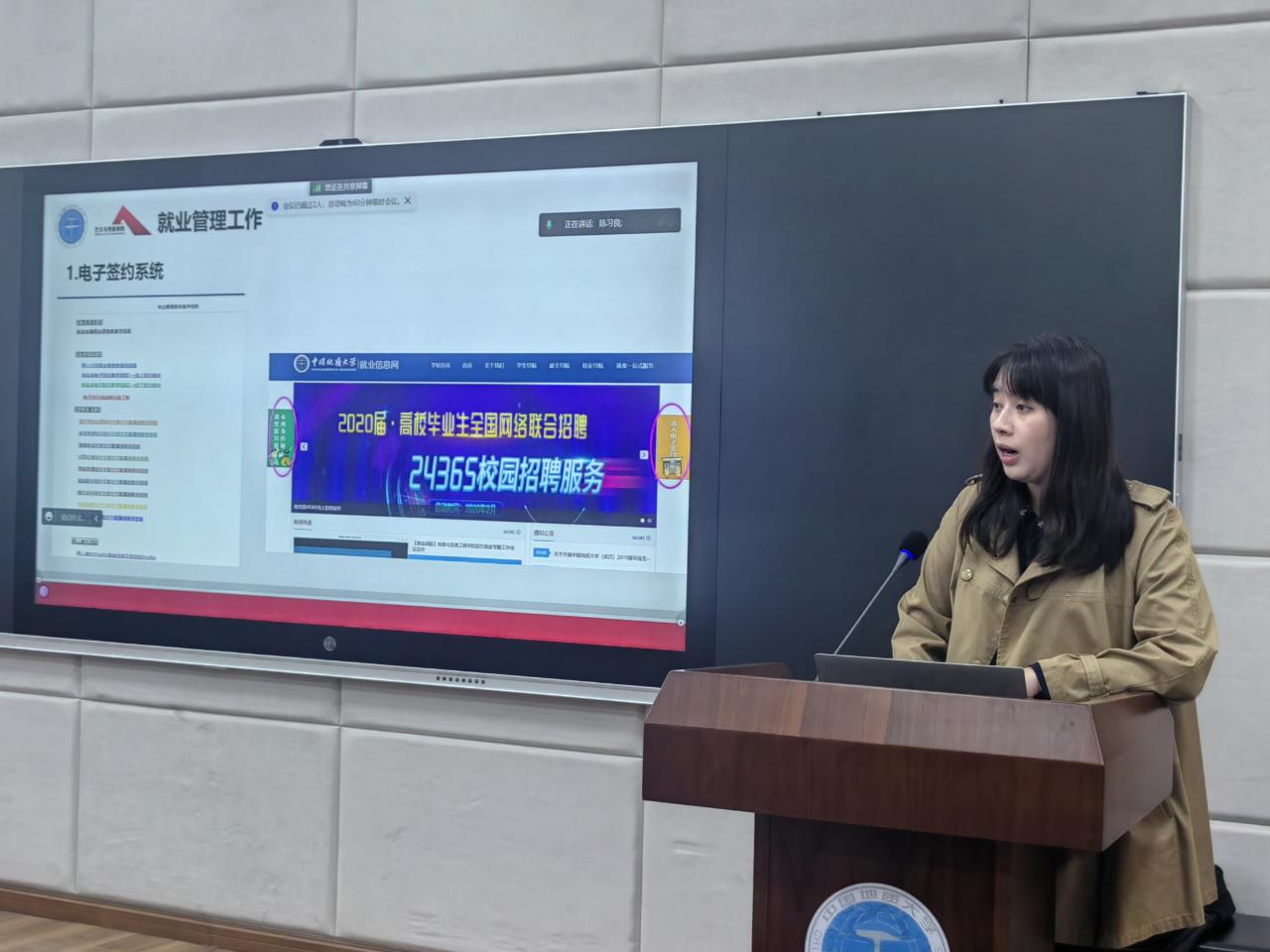 首先,由研究生辅导员单湉艺进行就业相关知识和工作进行讲解。单老师围绕就业业务知识、信息搜集管理、就业情况分析、就业工作要求四个方面,为毕业生们进行了全面深入的讲解。并且介绍了电子签约系统、就业推荐表以及签约流程等内容,同时结合学院近几年就业形势发起动员,希望同学们能够及时把握就业形势变化,树立正确目标,增强就业信心。