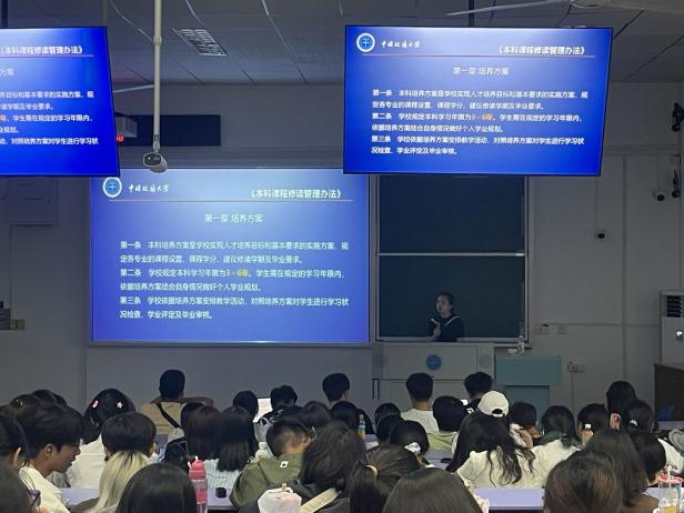 第三场讲座于下午14:30开始,主讲人是学工组辅导员曾戈晖老师。曾老师为2023级新生讲解了大学生奖励与资助的相关政策,包括国家奖学金、国家励志奖学金、地大英才奖学金、本科生社会奖学金和社会助学金等各项奖助学金的基本评选条件。她还为同学们解释了勤工助学岗位的申请方法,为家庭困难的学生指引方向。