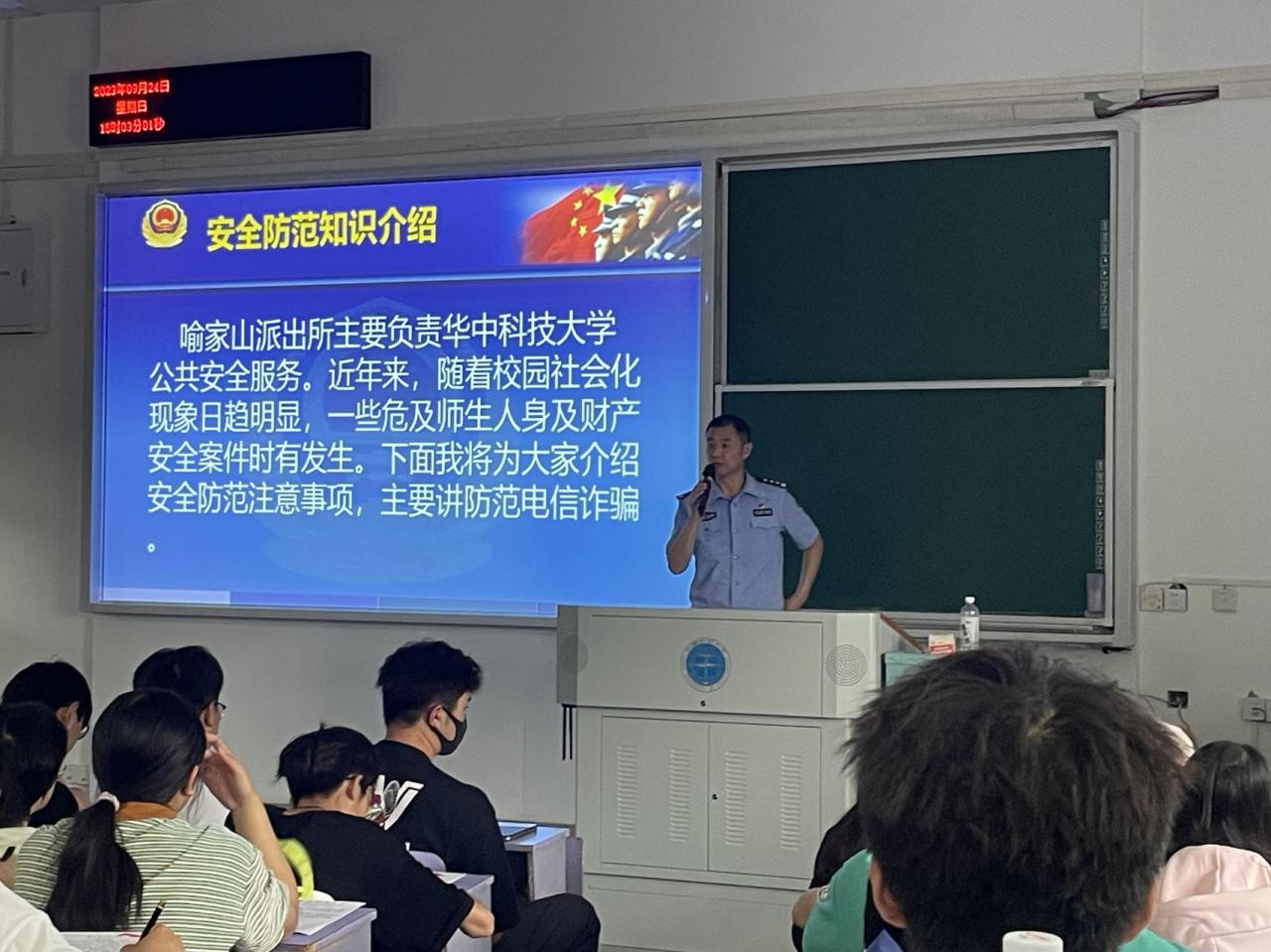 第四场讲座是由武汉市公安局喻家山派出所王东警官主讲的《安全防范知识介绍》。王东警官首先宣讲了大学生防电信网络诈骗的安全知识,注意人身、财产安全以及无意识中的违法行为等问题,为刚步入大学的新生敲响了警钟。随后,他通过我校以往诈骗真实案例警示新生要提高自身的防骗意识,认清网络诈骗形式的多样性。
