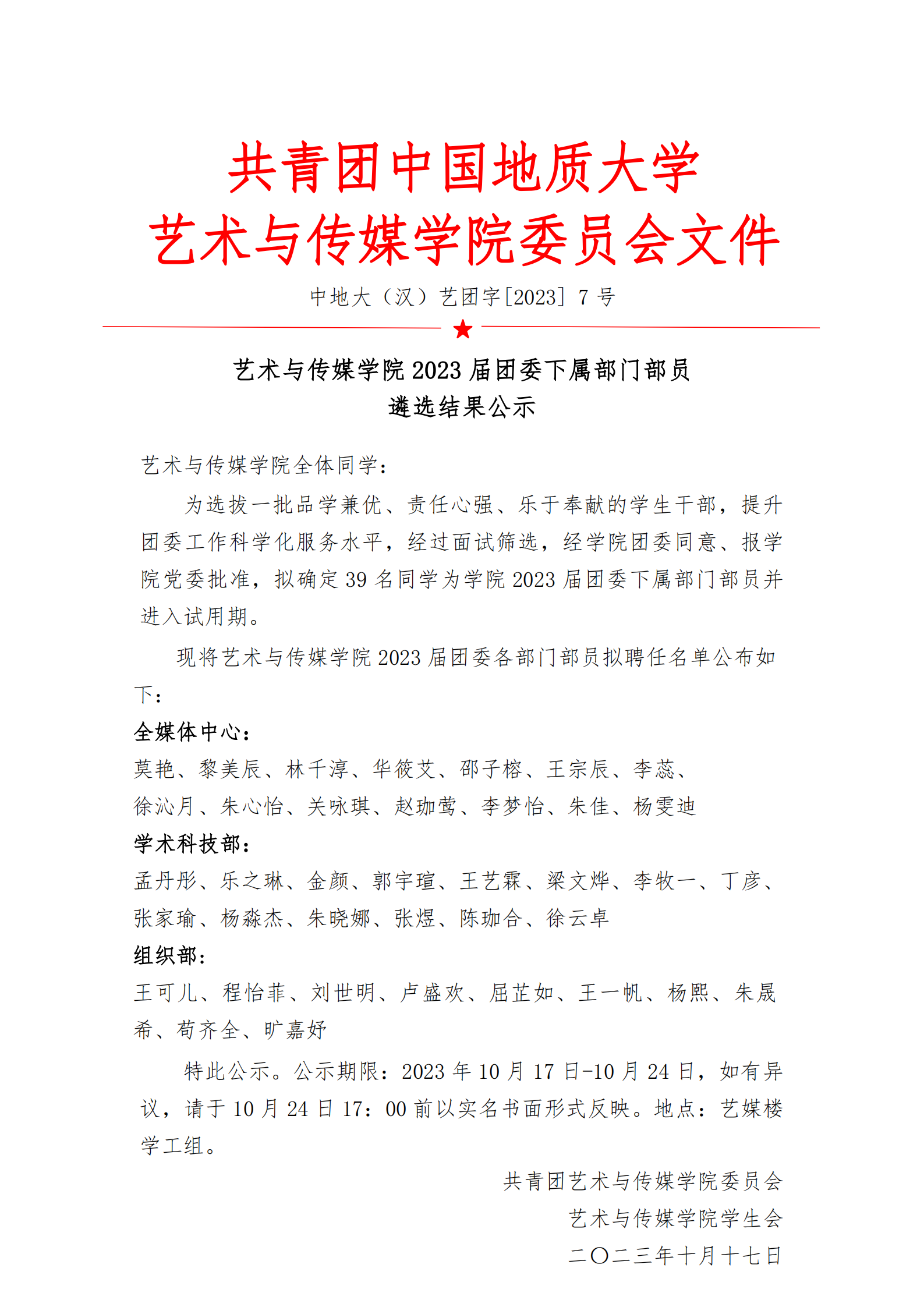 通知 | bevictor伟德2023届团委下属部门部员遴选结果公示