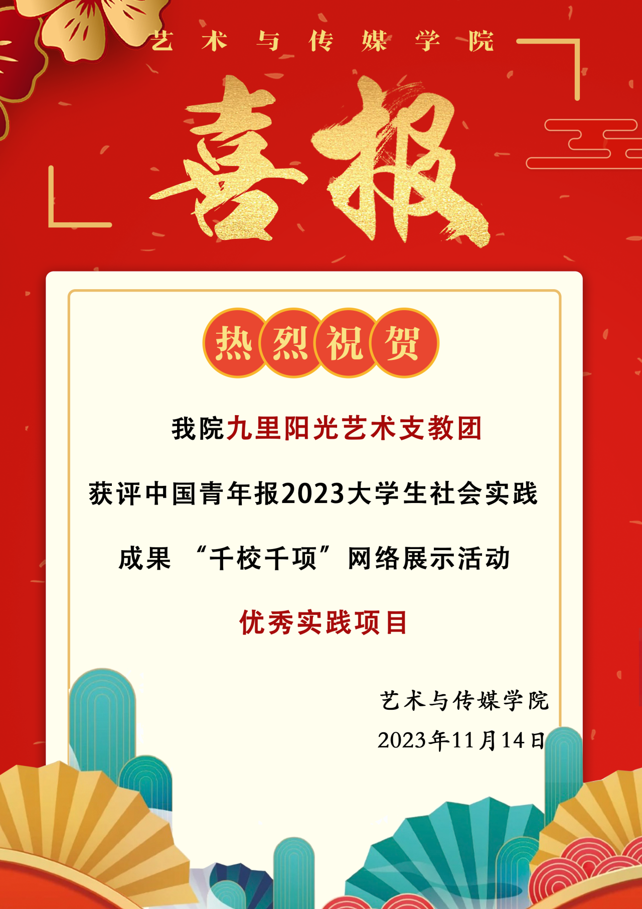 喜报!bevictor伟德九里阳光艺术支教团获评中国青年报2023大学生社会实践成果“千校千项”网络展示活动优秀实践项目